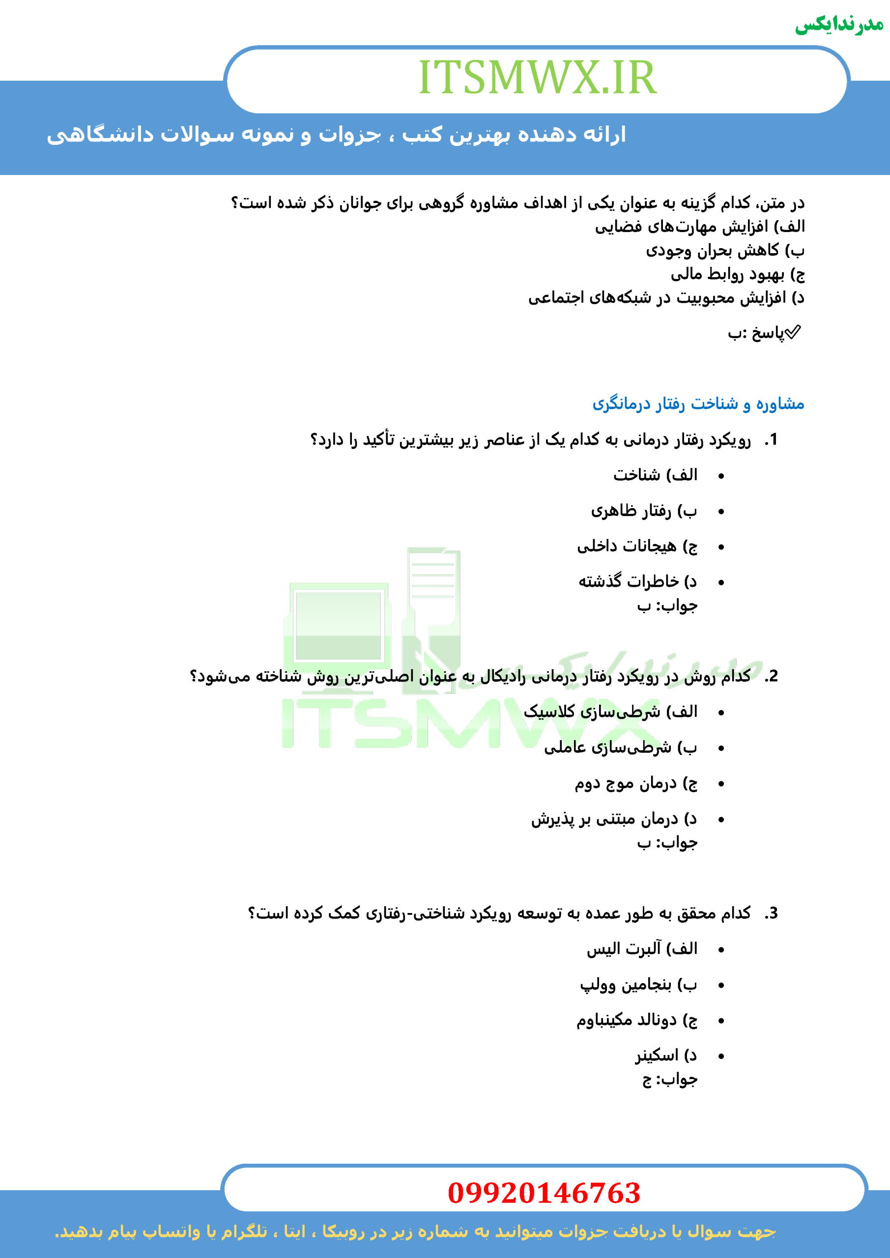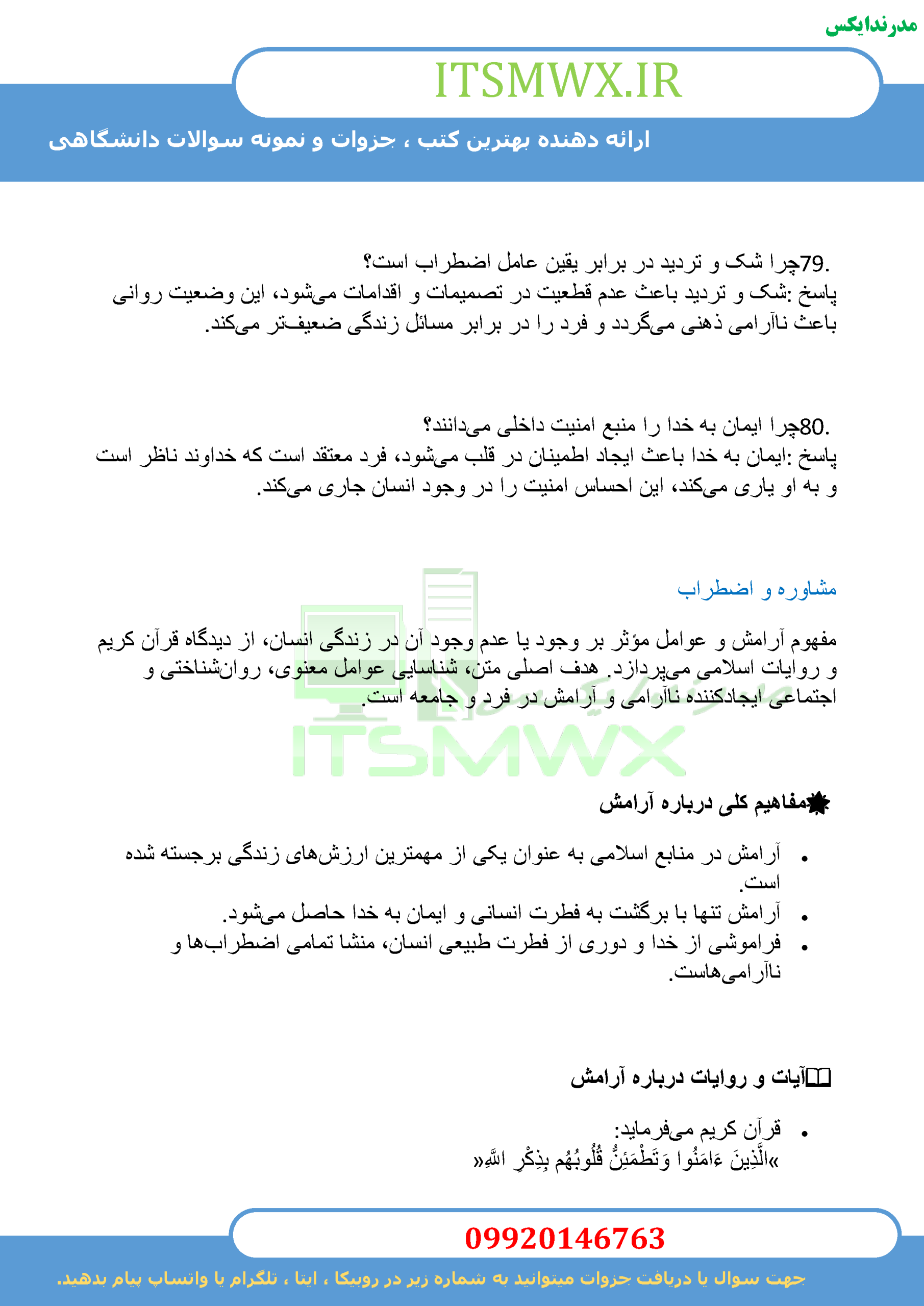 اگر به دنبال بالابردن نمره درسی ، موفقیت در آزمونهای دانشگاهی یا ورود به دورههای بالاتر تحصیلی هستید، نمونه سوالات تستی و تشریحی فصل به فصل کتاب “جوان و آرامش روان” به همراه خلاصههای جامع ، بهترین گزینه برای شماست. این مجموعه نه تنها به شما کمک میکند تا مطالب را بهتر یاد بگیرید، بلکه شما را برای مواجهه با انواع سوالات آماده میکند.
