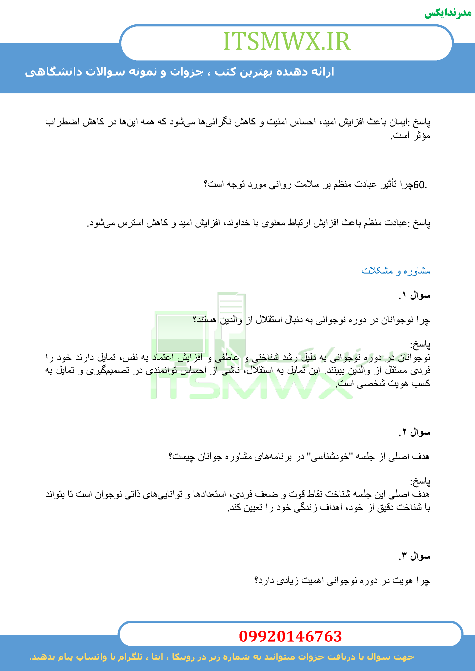 📌 نام مجموعه: نمونه سوالات تستی و تشریحی + خلاصه کتاب “جوان و آرامش روان”